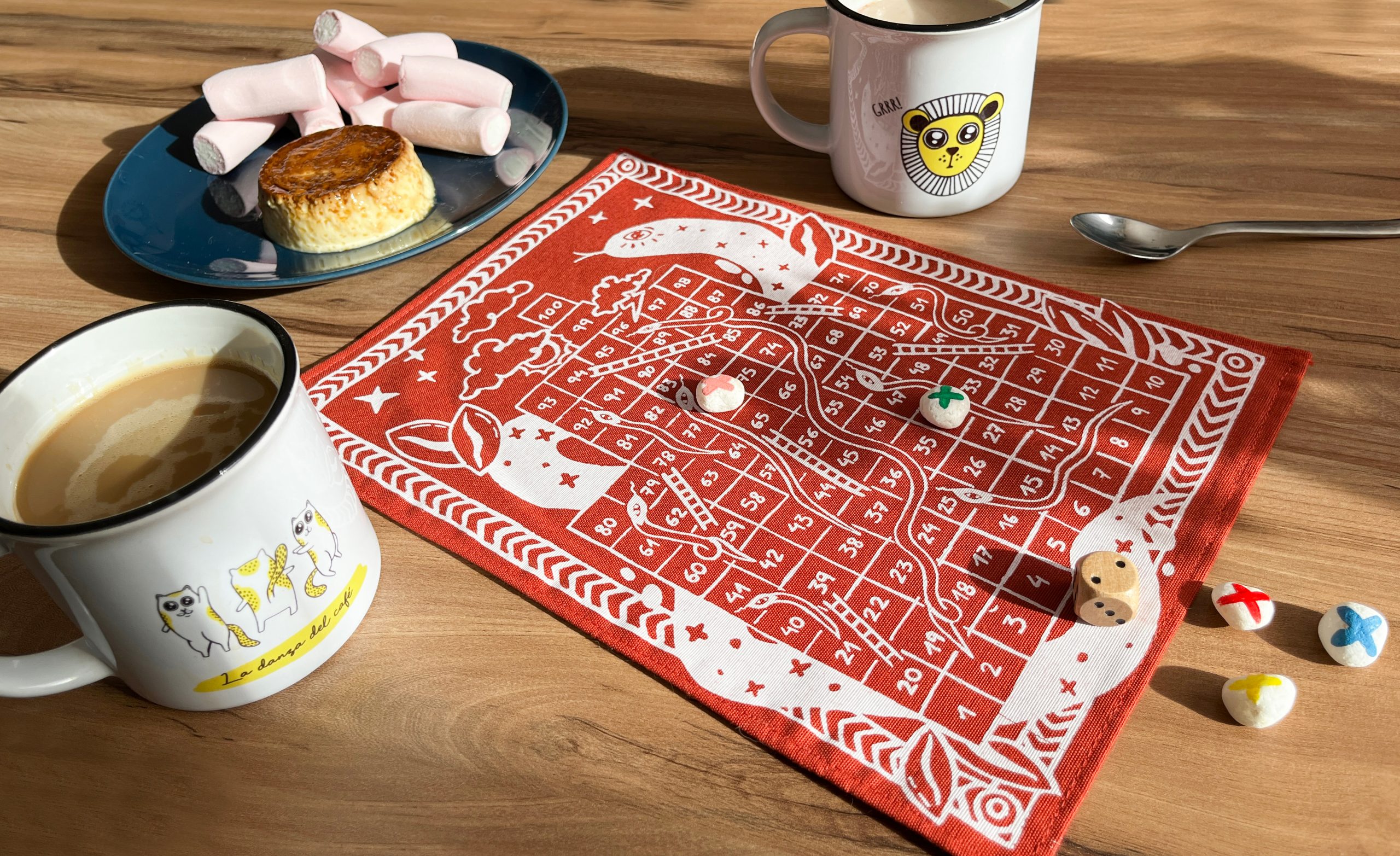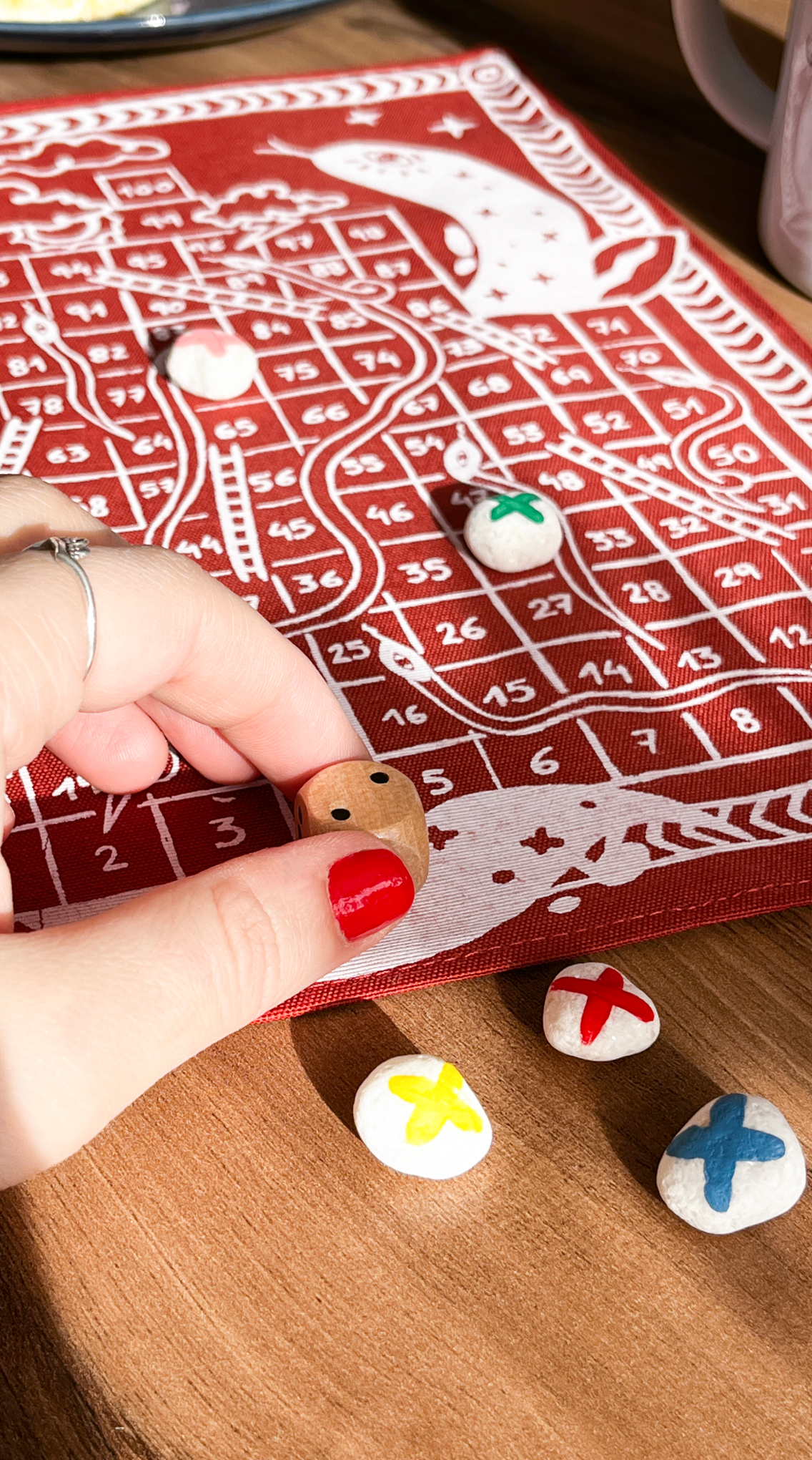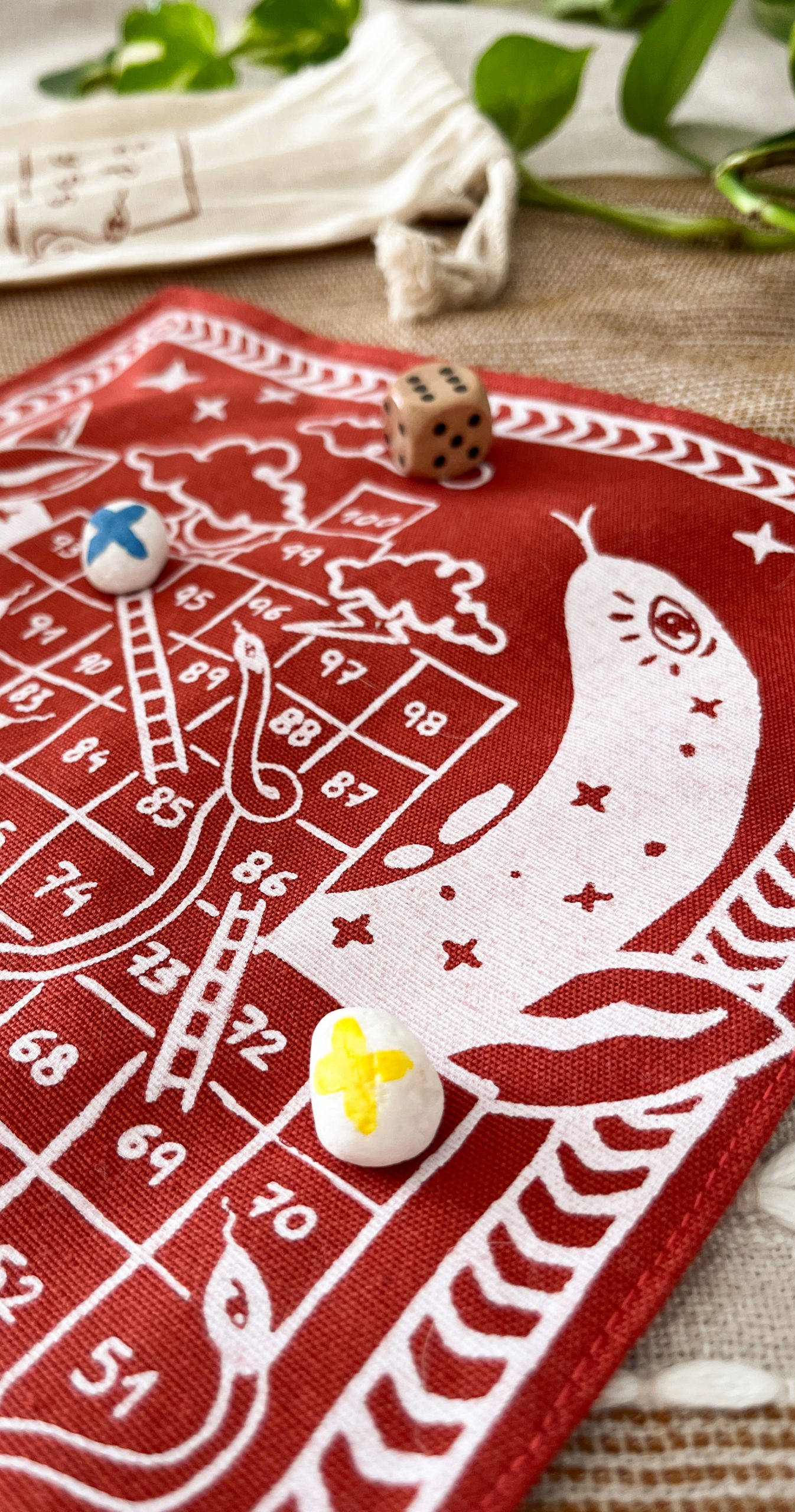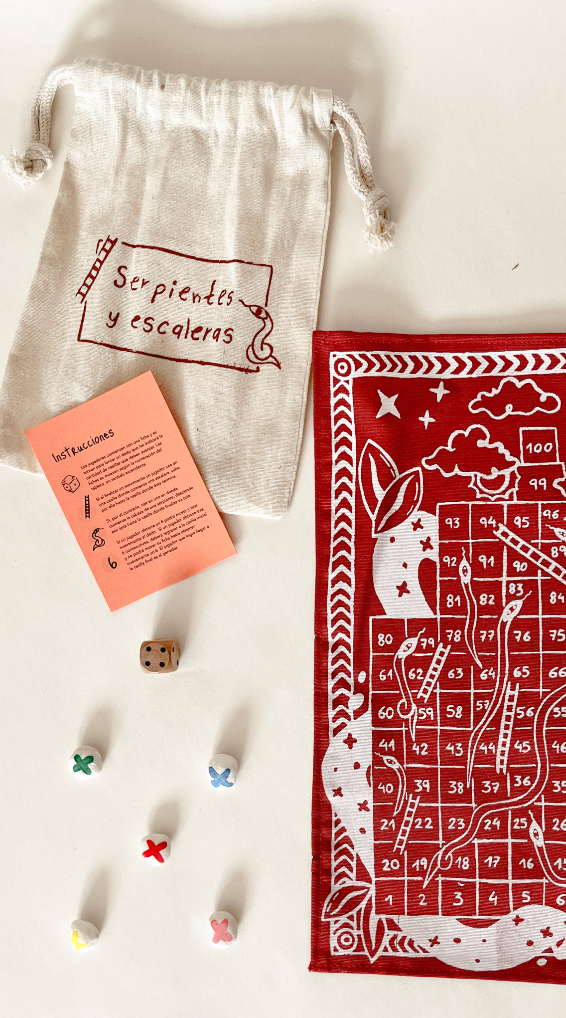 Tablero de tela con fichas de piedra y dado de madera. Completamente hecho a mano.